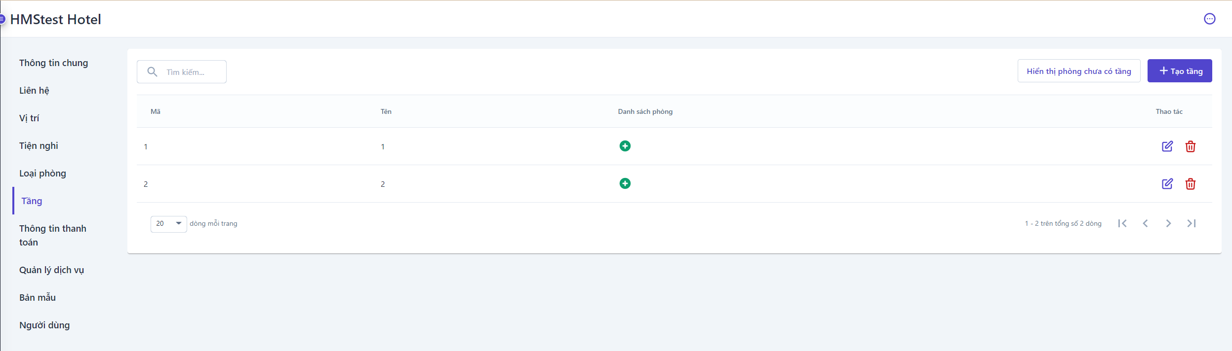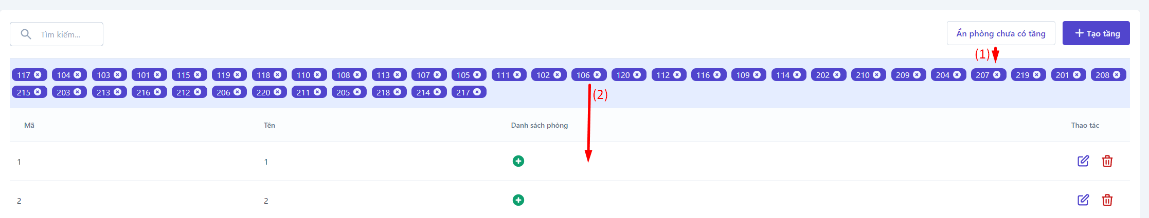 ![]() (1) Tìm kiếm: Nhập thông tin tầng cần tìm kiếm (2) Hiển thị phòng chưa có tầng: ![]()