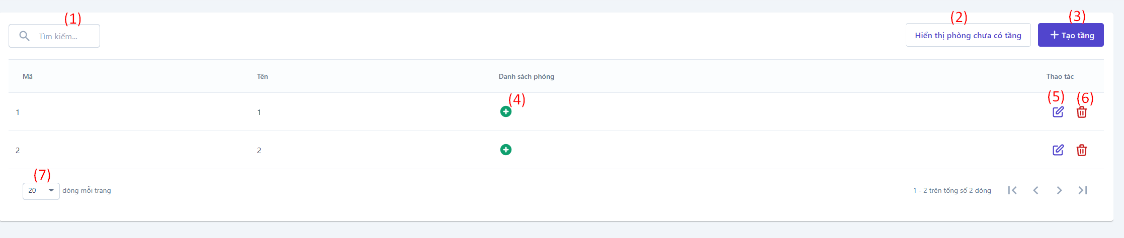 (5) Cập nhật tầng: Chọn để cập nhật lại các thông tin Tên tầng, mô tả hoặc bật tắt thanh trạng thái (6) Xóa tầng: Chọn để xóa thông tin tầng (7) Chọn số dòng hiển thị trên mỗi trang |