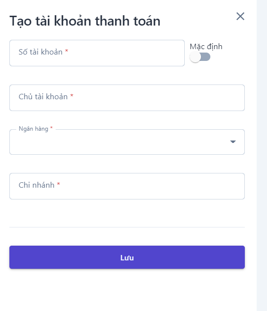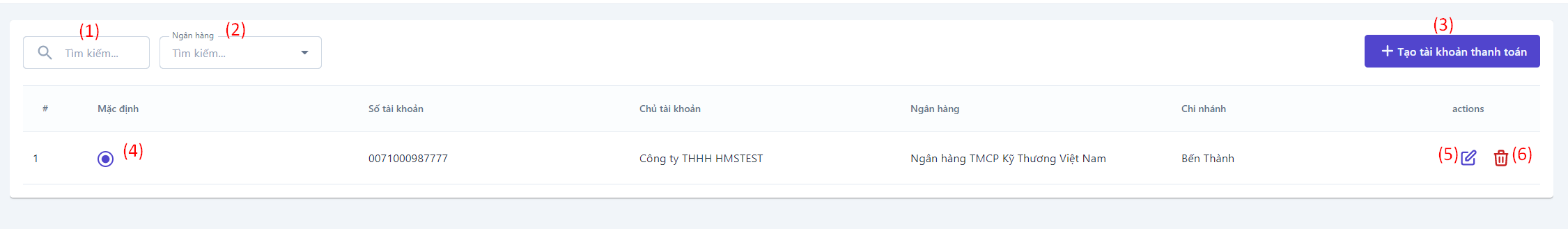 ![]() (1) Tìm kiếm: Nhập tìm kiếm tài khoản thanh toán theo các thông tin số tài khoản, tên tài khoản.. (2) Lọc theo ngân hàng: Lọc theo ngân hàng cần tìm kiếm tài khoản thanh toán (3) Tạo tài khoản thanh toán: ![]()