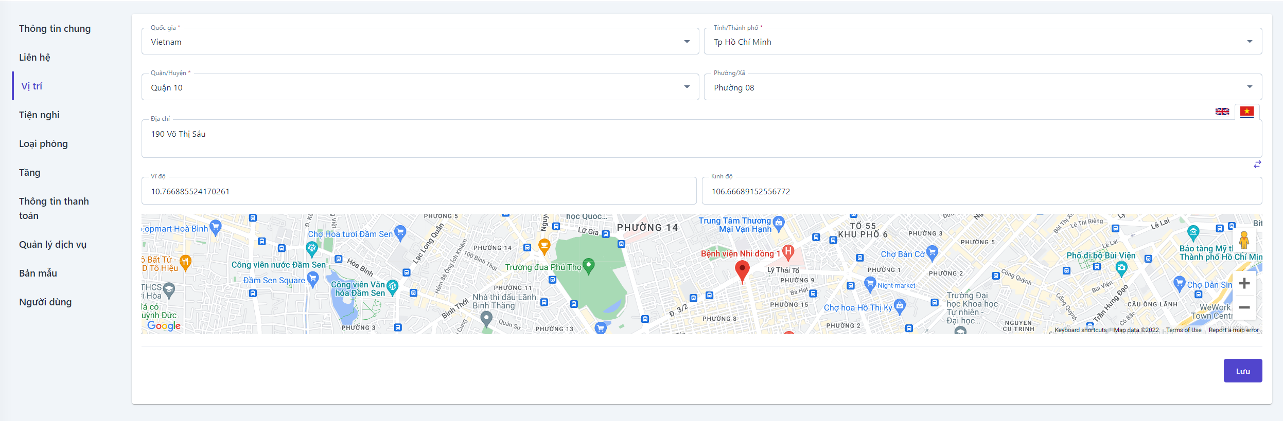 Các thông tin về vị trí cần được cập nhật thông tin đầy đủ, khi cấu hình các thông tin này, hệ thống sẽ đồng bộ thông tin vị trí của cơ sở lên các trang bán phòng